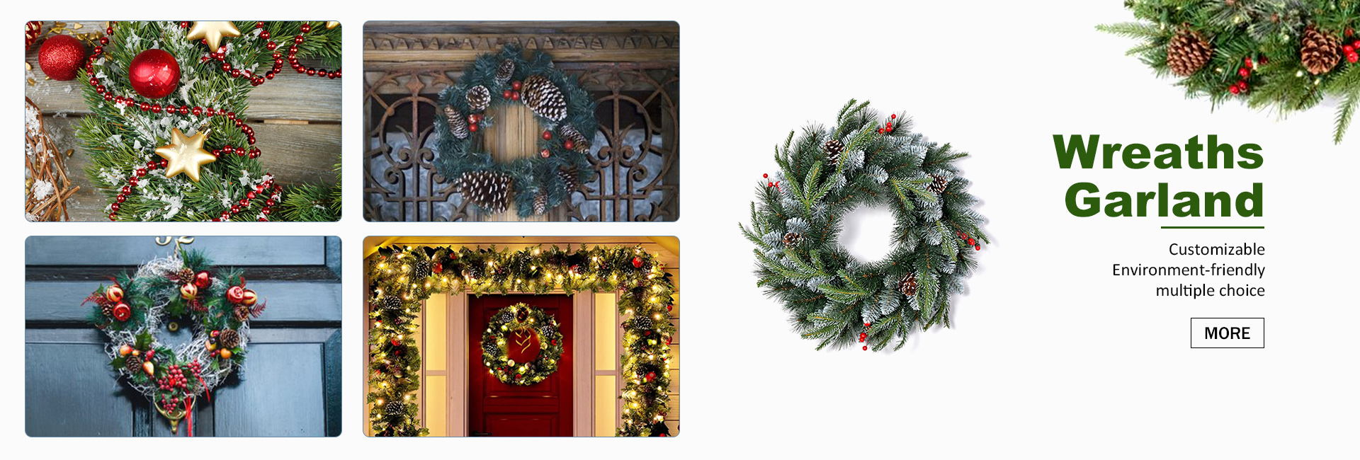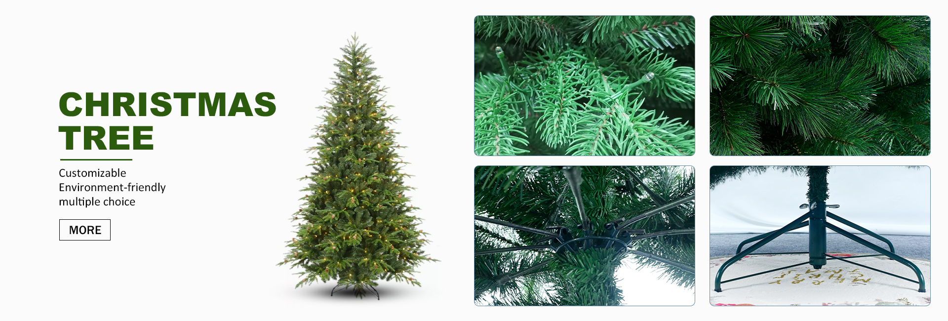 The main products include: PE Christmas tree, PVC Christmas tree, flocking tree, garland, Wreaths and other Christmas decorations. The company has 25 professional designers to customize products for customers, and has more than 500 sets of injection molds to meet customers' different design needs. The products are 100% exported, and the products are sold to Europe, America, Asia,South America and so on. World-renowned supermarkets have in-depth cooperation with us. The company also has overseas warehouses in the United States to provide drop shipping service.
