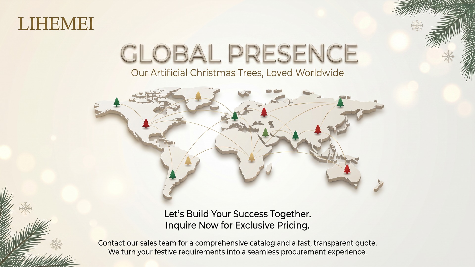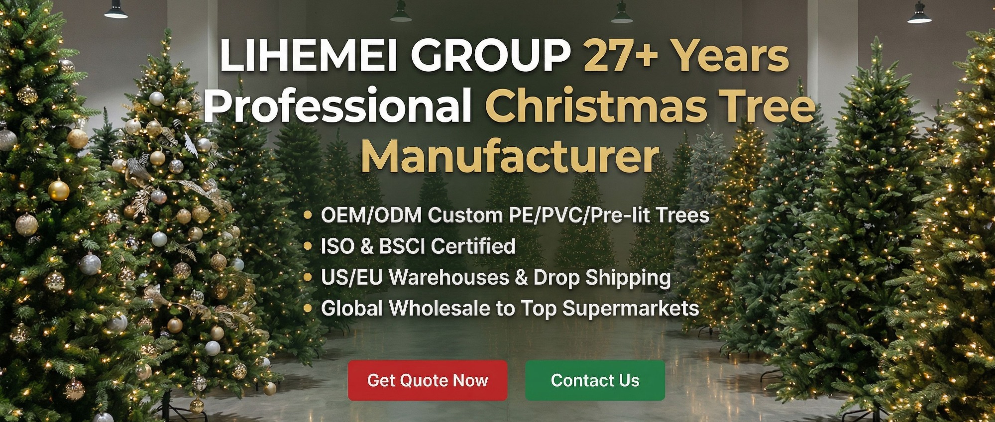 Huizhou Liheme Electric Appliance Co., Ltd.. is a large-scale modern factory with 26 years of experience in Christmas tree production and design. Its headquarter is located in Heyuan, Guangdong, covering an area of 26,000 ㎡. There are two branches nationwide, located in Huizhou, Guangdong and Dongguan, Guangdong. Can provide one-stop service from raw material processing to Tree.