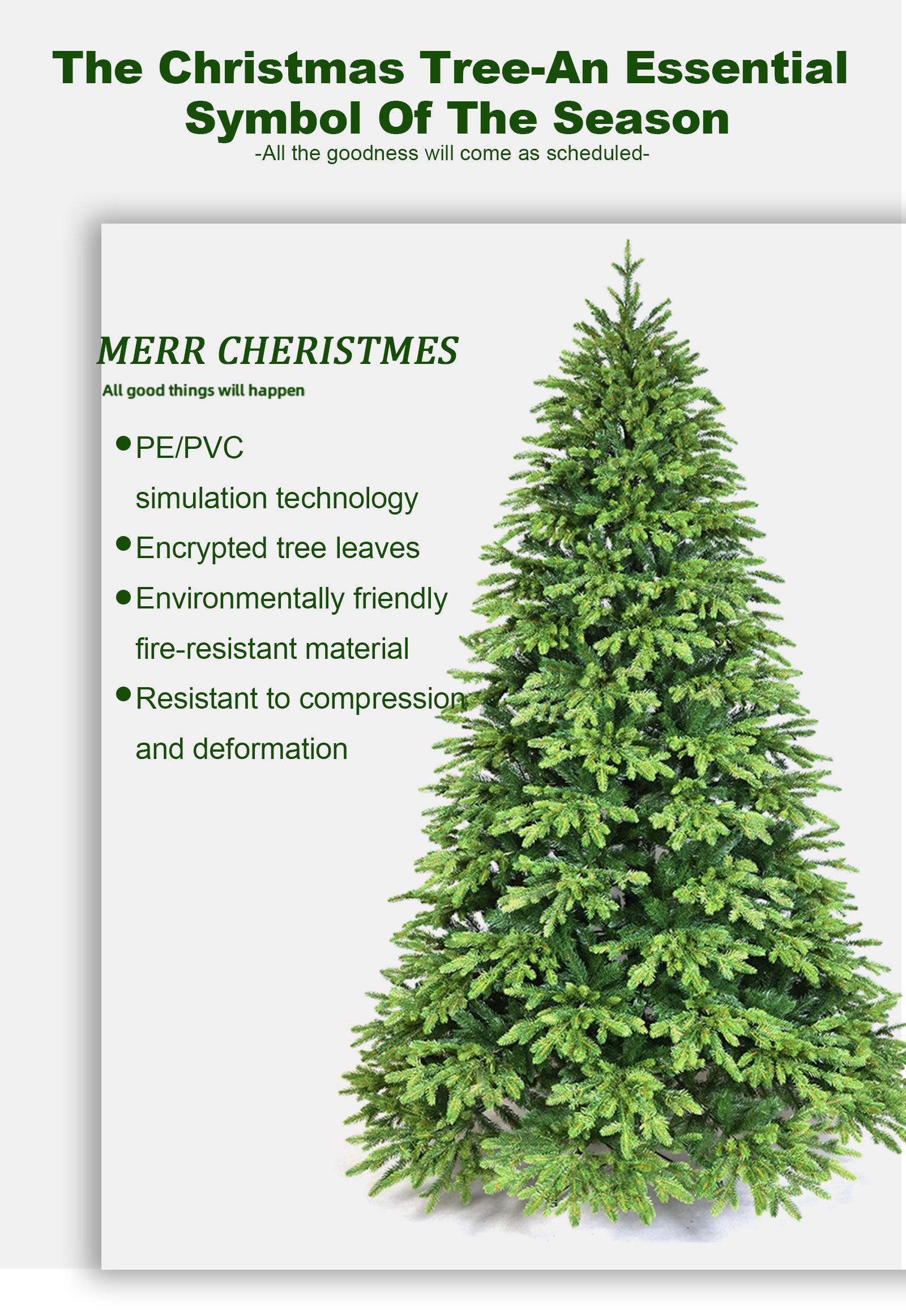 Elevate your holiday decorations with our plush all-PE Christmas tree. Immerse yourself in the cozy ambiance created by its abundant foliage and lifelike appearance. Whether you desire a grand centerpiece or a compact display, our customizable sizes ensure a perfect fit for your unique celebration. Unleash the magic of the season with this stunning tree!